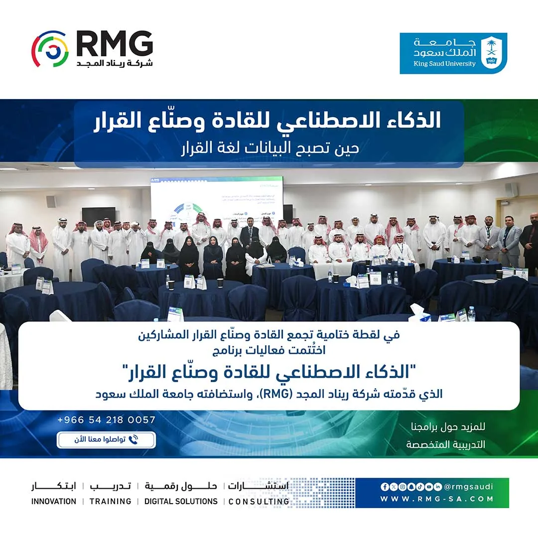 اختُتمت فعاليات برنامج “الذكاء الاصطناعي للقادة وصنّاع القرار“، الذي قدّمته شركة ريناد المجد (RMG)، واستضافته جامعة الملك سعود، بعد يومين من الطرح المعرفي والتطبيقي الذي استهدف تمكين القيادات وصنّاع القرار من فهم أعمق لتوظيف الذكاء الاصطناعي داخل بيئات العمل.