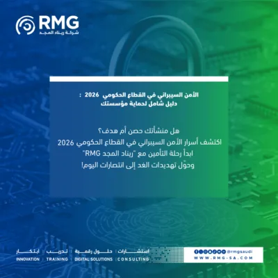 هل منشأتك حصن أم هدف؟ اكتشف أسرار الأمن السيبراني في القطاع الحكومي 2026. ابدأ رحلة التأمين مع “ريناد المجد RMG” وحوّل تهديدات الغد إلى انتصارات اليوم!