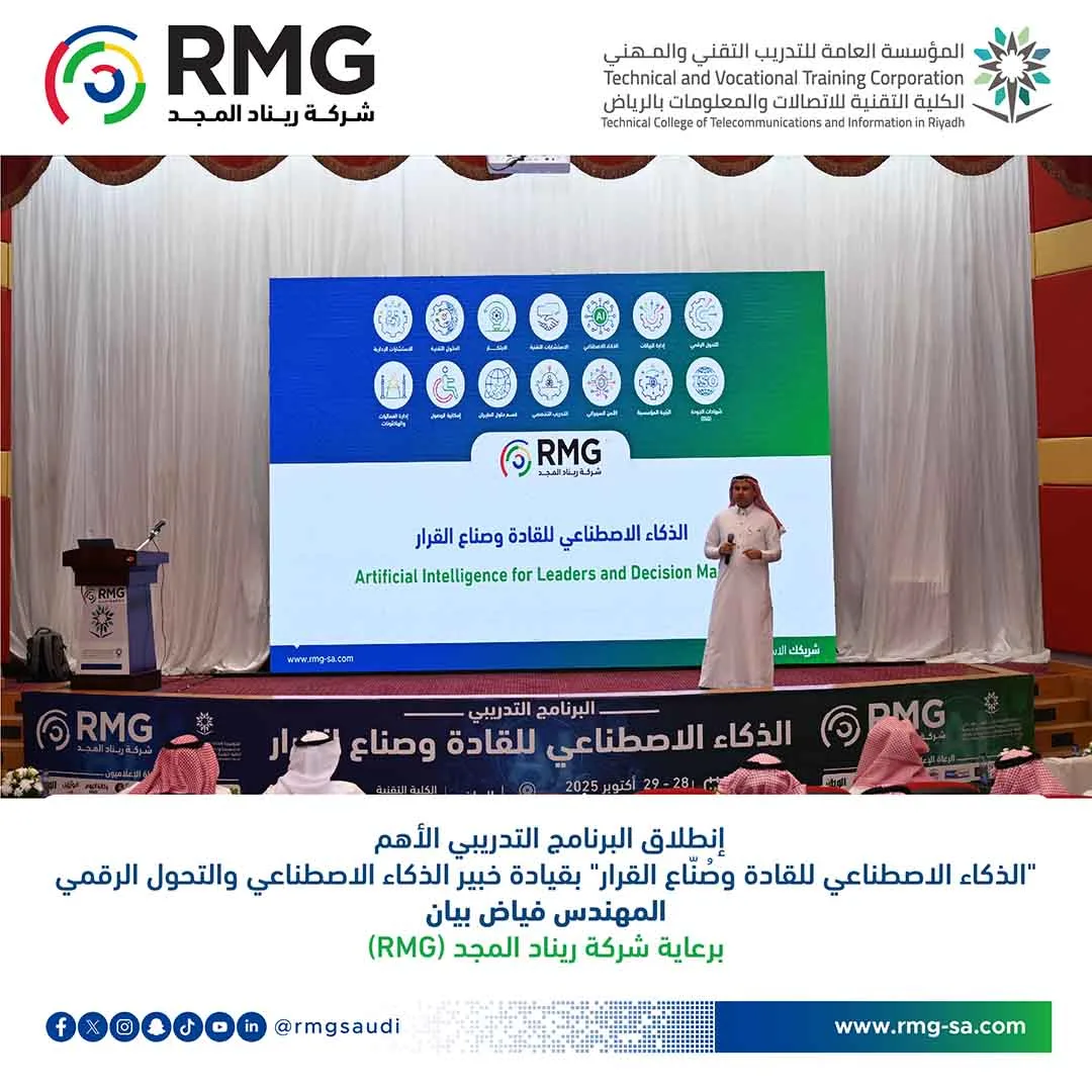 “الذكاء الاصطناعي للقادة وصُنّاع القرار“ البرنامج التدريبي الأبرز والأكثر تأثيرًا في ساحة تطوير القيادات وصُنّاع القرار في المملكة، بقيادة خبير الذكاء الاصطناعي والتحول الرقمي المهندس فياض بيان، وبرعاية شركة ريناد المجد (RMG) – رائدة الابتكار والتحول الرقمي في المملكة والمنطقة.