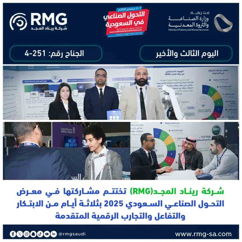 اختتمت شركة ريناد المجد (RMG) مشاركتها البارزة في معرض التحول الصناعي السعودي 2025، الذي أُقيم في مركز الرياض الدولي للمؤتمرات والمعارض خلال الفترة من 1 إلى 3 ديسمبر 2025، وسط حضور واسع من الخبراء وصناع القرار والجهات الحكومية والخاصة.