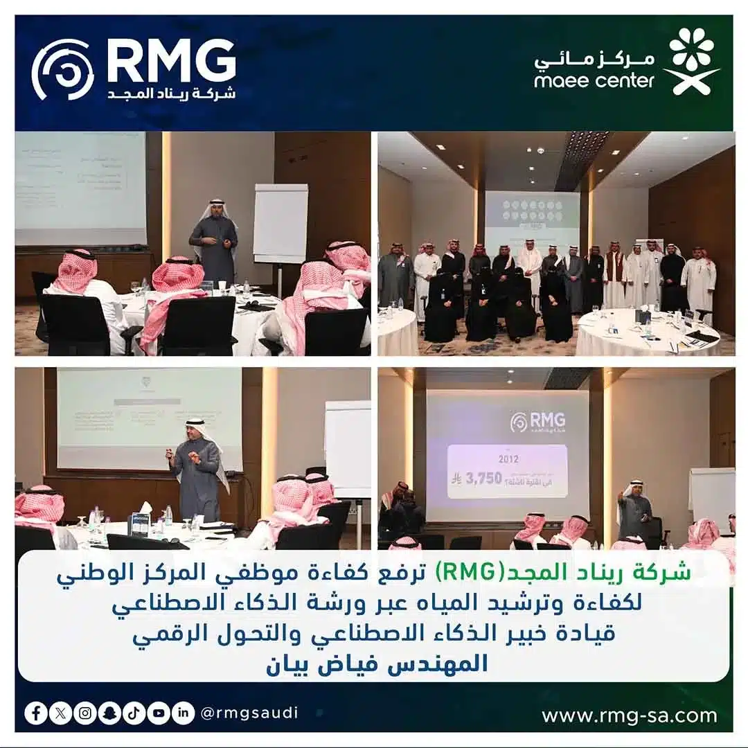 في خطوة نوعية نحو تعزيز قدرات موظفي الجهات الحكومية في المملكة، اختتمت ورشة الذكاء الاصطناعي لموظفي المركز الوطني لكفاءة وترشيد المياه بنجاح باهر، والتي قدّمها خبير الذكاء الاصطناعي والتحول الرقمي، المهندس فياض بيان، المدير التنفيذي لشركة ريناد المجد (RMG)، وسط تفاعل ملحوظ وتركيز كامل من المشاركين.