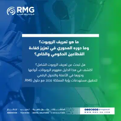 بعد استعراض تعريف الروبوت وأبعاده، يأتي الدور العملي للتطبيق. تُعد شركة ريناد المجد (RMG) شريكاً استراتيجياً رائداً في المملكة العربية السعودية والمنطقة، حيث تقدم حلولاً متكاملة تمكن الجهات الحكومية والشركات من استثمار تقنيات الروبوت والأتمتة بأعلى معايير الجودة العالمية.