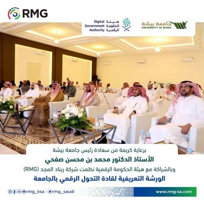 برعاية كريمة من سعادة رئيس جامعة بيشة الأستاذ الدكتور محمد بن محسن صفحي،وبالشراكة مع هيئة الحكومة الرقمية نظمت شركة ريناد المجد (RMG) الورشة التعريفية لقادة التحول الرقمي بالجامعة. وتأتي الورشة ضمن مجموعة مبادرات التطوير التي تشهدها الجامعة لمواكبة رحلة التحول الرقمي على المستوى الوطني.