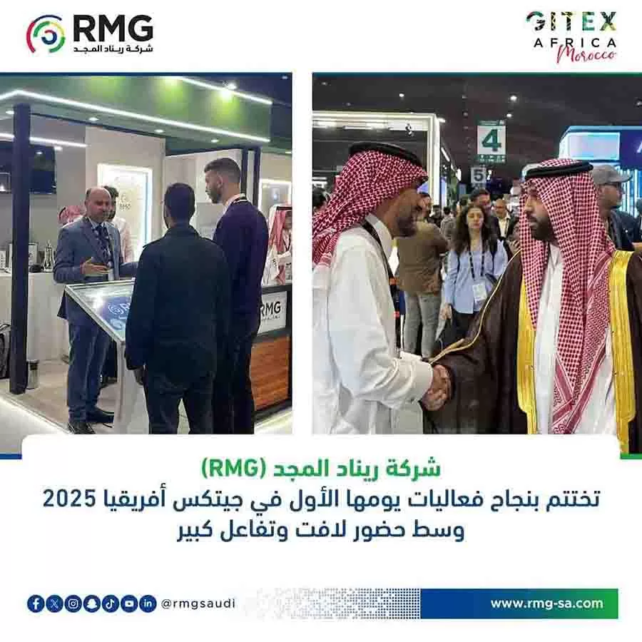 وفي قلب هذا الحدث الهام، سجلت شركة ريناد المجد (RMG)، الشركة السعودية الرائدة في مجال الحلول التقنية، حضوراً لافتاً ومميزاً منذ اللحظات الأولى لافتتاح المعرض. حيث شهد جناح الشركة، المصمم لعكس رؤيتها المستقبلية، نشاطاً مكثفاً وتوافداً ملحوظاً من الزوار والمهتمين، ليؤكد على مكانة الشركة كشريك تقني استراتيجي يسعى للمساهمة بفعالية في رحلة التحول الرقمي الطموحة للقارة الأفريقية.