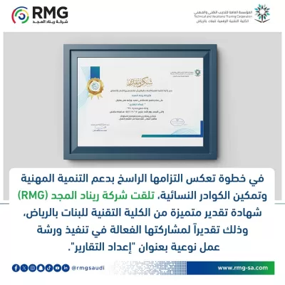 في خطوة تعكس التزامها الراسخ بدعم التنمية المهنية وتمكين الكوادر النسائية، تلقت شركة ريناد المجد شهادة تقدير متميزة من الكلية التقنية للبنات بالرياض، وذلك تقديراً لمشاركتها الفعالة في تنفيذ ورشة عمل نوعية بعنوان “إعداد التقارير”. يأتي هذا التكريم بمثابة شهادة حية على الدور المحوري الذي تضطلع به الشركة في إثراء المشهد التدريبي والمعرفي، وتعزيز قدرات المتدربات في الكلية التقنية للبنات بالرياض، وتأكيداً على ريادتها في مجال تقديم الحلول التدريبية والاستشارية المتخصصة.
