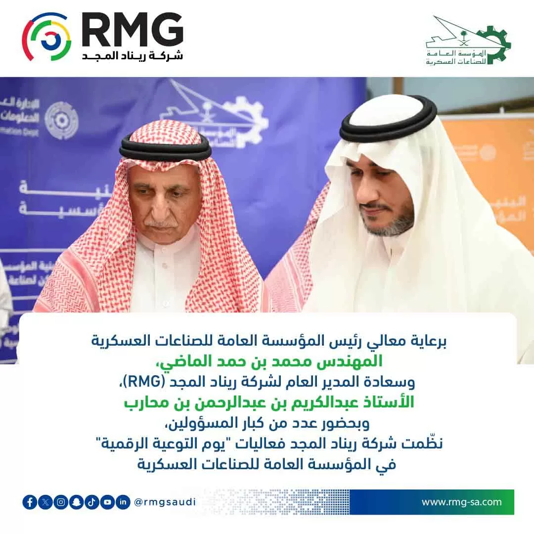 في حدث استثنائي يجسد عمق الشراكة بين القطاع الخاص والمؤسسات الوطنية الحيوية، نظّمت شركة ريناد المجد (RMG)، الرائدة في حلول واستشارات التحول الرقمي، فعاليات يوم التوعية الرقمية في المؤسسة العامة للصناعات العسكرية. برعاية معالي رئيس المؤسسة العامة للصناعات العسكرية المهندس محمد بن حمد الماضي، وسعادة االأستاذ عبدالكريم بن عبدالرحمن بن محارب المدير العام لشركة ريناد المجد (RMG)، وبحضورعدد من كبار المسؤولين، مما أضفى على الحدث أهمية استراتيجية بالغة، ويعكس التزام القيادة العليا بتبني أحدث المنهجيات الرقمية لتعزيز القدرات الصناعية الدفاعية للمملكة.
