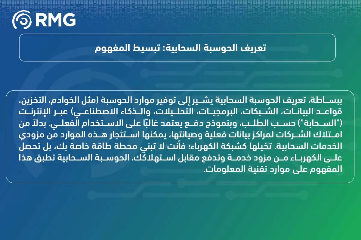 ببساطة، تعريف الحوسبة السحابية يشير إلى توفير موارد الحوسبة (مثل الخوادم، التخزين، قواعد البيانات، الشبكات، البرمجيات، التحليلات، والذكاء الاصطناعي) عبر الإنترنت (“السحابة”) حسب الطلب، وبنموذج دفع يعتمد غالبًا على الاستخدام الفعلي. بدلاً من امتلاك الشركات لمراكز بيانات فعلية وصيانتها، يمكنها استئجار هذه الموارد من مزودي الخدمات السحابية. تخيلها كشبكة الكهرباء؛ فأنت لا تبني محطة طاقة خاصة بك، بل تحصل على الكهرباء من مزود خدمة وتدفع مقابل استهلاكك. الحوسبة السحابية تطبق هذا المفهوم على موارد تقنية المعلومات.