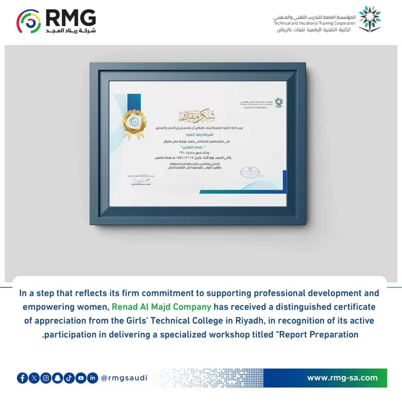 In a step that reflects its firm commitment to supporting professional development and empowering women, Renad Al Majd Company has received a distinguished certificate of appreciation from the Girls’ Technical College in Riyadh, in recognition of its active participation in delivering a specialized workshop titled “Report Preparation.” This honor serves as tangible evidence of the pivotal role the company plays in enriching the training and knowledge landscape, enhancing the capabilities of trainees at the Girls’ Technical College in Riyadh, and affirming its leadership in providing specialized training and consulting solutions.