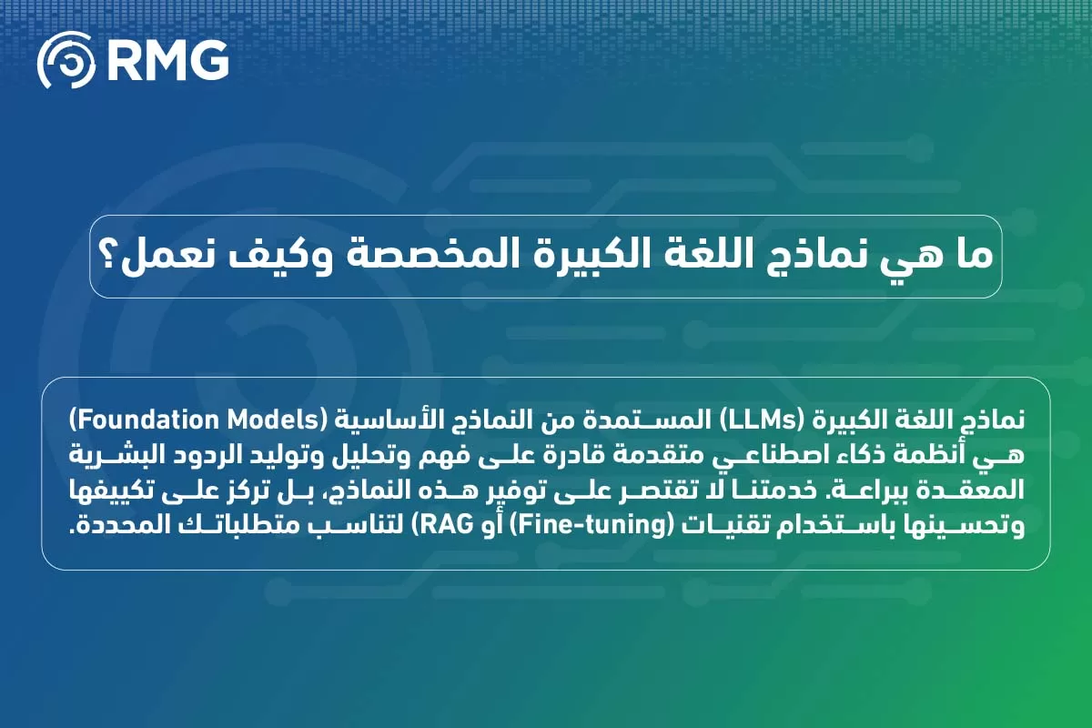 Renad Al-Majd (RMG ) offers “Large Language Model Customization (LLMs)“, your gateway to having advanced AI capabilities tailored to your unique needs. We enable you to build language models that excel at analyzing your data, providing intelligent consulting, automating tasks, and revolutionizing the experience of your customers and employees.