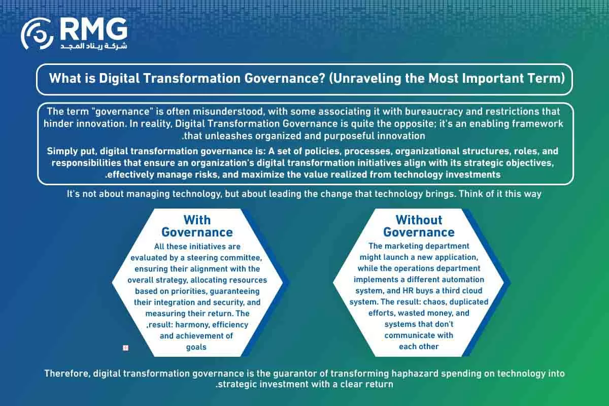 The answer lies in a concept that may not shine as brightly, but it is the cornerstone of any successful digital journey: Digital Transformation Governance. It’s the compass that guides the ship, the constitution that regulates the relationship between all parties, and the control tower that ensures all digital planes take off and land safely. This article is your guide to understanding what this governance is, its utmost importance in the Saudi context, and how to build an effective framework that ensures your digital ambitions transform into tangible and sustainable reality.