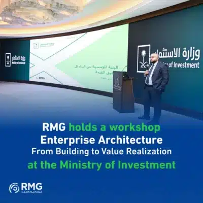 Renad Al-Majd (RMG) delivered a specialized workshop titled “Enterprise Architecture: From Construction to Value Realization” for employees of the Ministry of Investment. This initiative aims to empower government entities to adopt best practices in Enterprise Architecture (EA) and achieve sustainable impact.