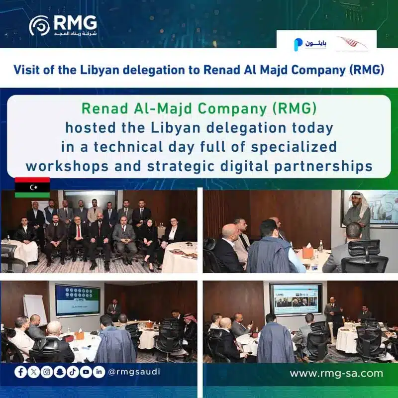 The meeting witnessed official welcome speeches that confirmed the company’s strategic directions, where Mr. Abdulkarim bin Abdulrahman bin Muhareb, General Manager of Renad Al-Majd Company (RMG), welcomed the Libyan delegation, noting that this visit represents an important step towards enhancing Arab cooperation in the fields of technology and digital transformation.