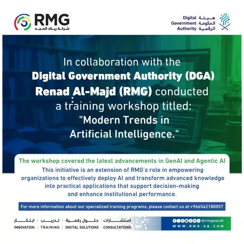 Renad Al-Majd (RMG), in cooperation with the Digital Government Authority (DGA), delivered an advanced virtual training workshop titled “Modern Trends in Artificial Intelligence.” Dedicated to DGA employees, the session aimed to enhance knowledge of the latest digital innovations and their practical applications within government entities. The workshop focused on highlighting cutting-edge technologies, such as Generative AI (GenAI) and Agentic AI, emphasizing how these tools can optimize institutional performance and bolster decision-making capabilities.