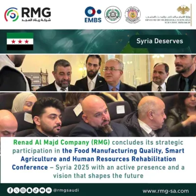 Renad Al-Majd Company (RMG) concluded its participation as a strategic partner in the Conference on Quality Food Processing, Smart Agriculture and Human Resources Rehabilitation – Syria 2025, organized by EMBS for Management Engineering and Quality, with the wide participation of experts, decision makers, academics, and representatives of government and private entities.