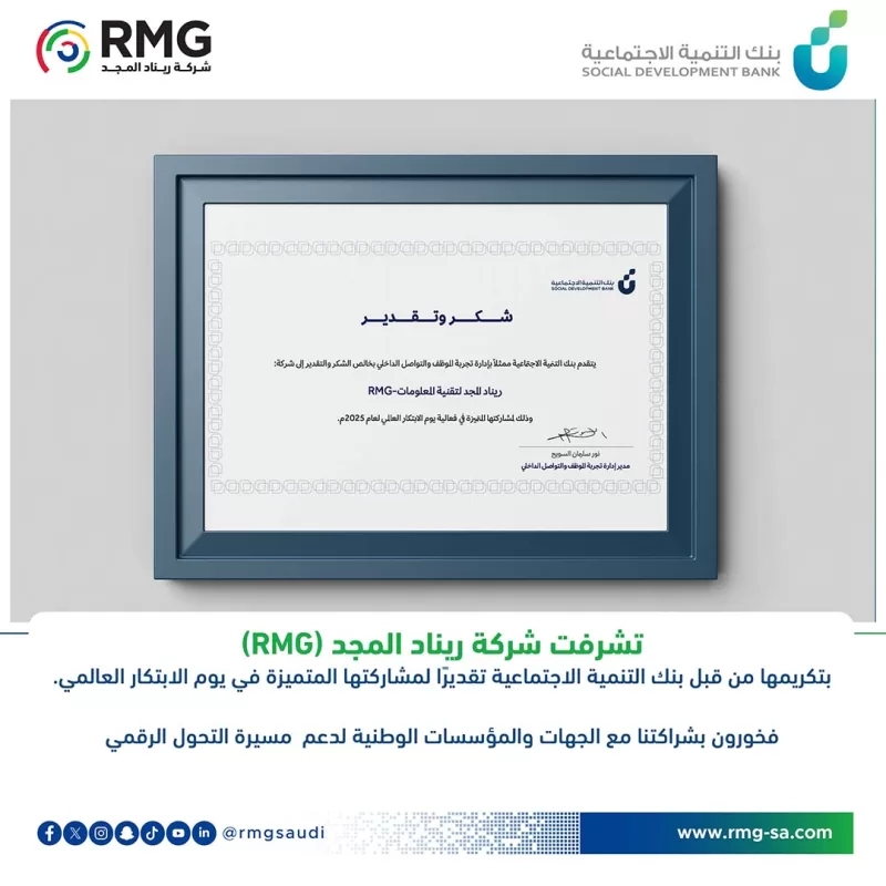 In a move that reflects deep appreciation for the pivotal role played by leading national companies in driving innovation and achieving comprehensive development goals, the Social Development Bank, one of the leading national financial institutions, honored Renad Al Majd (RMG) in recognition of its exceptional and qualitative participation in the “Innovation and Creativity Day” event recently organized by the bank. This participation was not merely a typical attendance; rather, it was a living embodiment of the ambitious vision adopted by “Renad Al Majd” in harnessing the latest technologies and innovation methodologies to serve the community and institutions, making it a role model in this vital field.