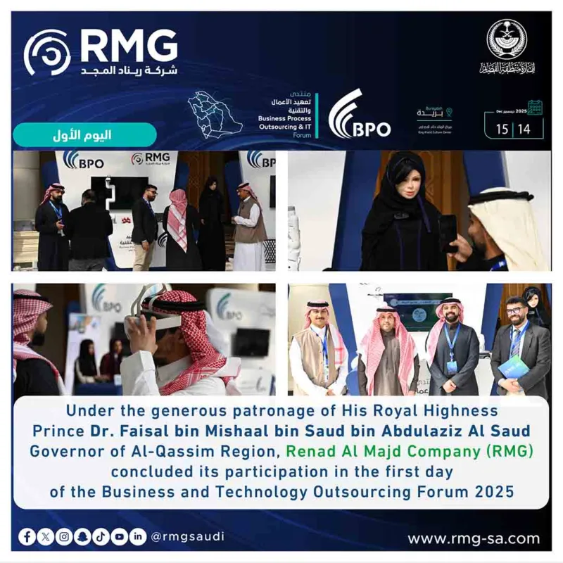 Renad Al-Majd Company (RMG) concluded its participation in the first day of the Business and Technology Outsourcing Forum 2025 with a remarkable presence and wide interaction, showcasing the latest emerging technologies and digital transformation solutions, in a participation that reflects its expertise and role in supporting the future of outsourcing in the Kingdom of Saudi Arabia.